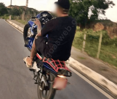 Além da infração pela manobra de alto risco, o motociclista comete pelo menos outras duas infrações de trânsito, não utiliza o capacete e está guiando a moto usando sandálias.